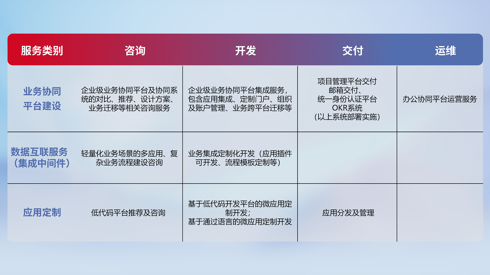 针对钉钉、、、企微、、、、IDaas等平台级产品提供产品的规划、、方案、、交付、、、定制化开发等服务,,实现如统一协同办公、、、、智能客户服务、、混合会议管理、、、智能数据查询、、、、等业务场景,,,实现数字化转型。。。